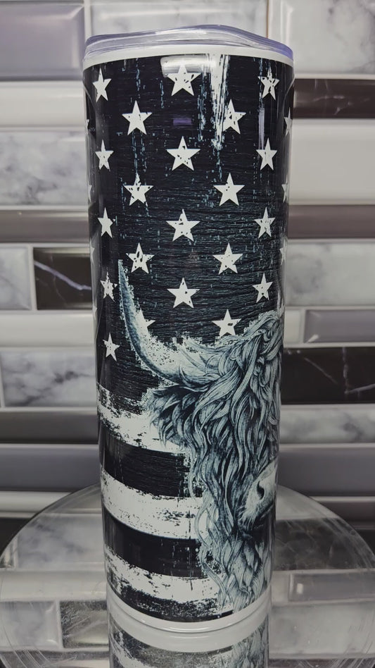 Heiffer with Sunflower and distressed flag 20 oz. Stainless tumbler